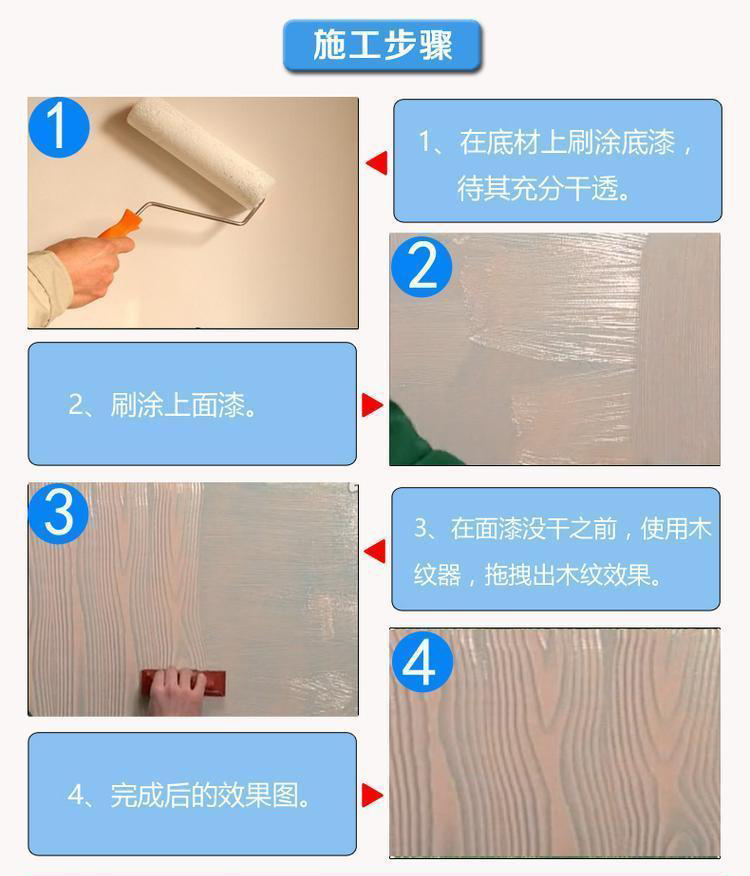4、可呈現各種木紋狀藝術圖案,圖案隨意、細膩、無接縫、不起皮、不開裂,底色和面色可以自由搭配,圖案可任意創(chuàng)作。古色古香,壽命長;